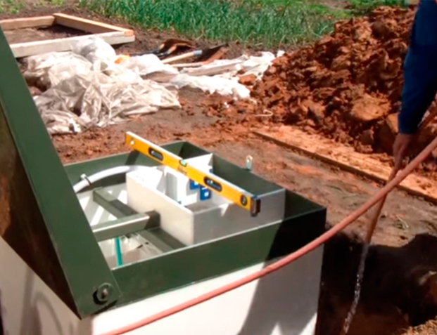 6. 6. Установка септика Топас. Опустите станцию в котлован и аккуратно выровняйте его, чтобы он стоял строго горизонтально и вертикально. Допустимое отклонение - не более 5 мм.